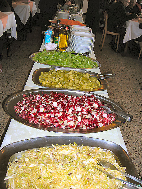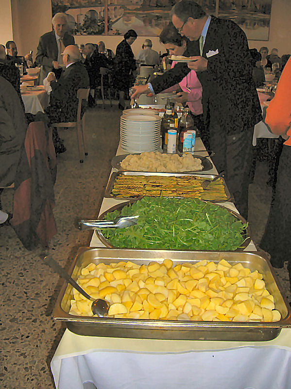 Ore 12.30 il pranzo. Le cene ed i pranzi ai nostri raduni, sono spesso il punto debole dell’organizzazione, nonostante gli sforzi per organizzare tutto al meglio, giungono critiche da parte dei convenuti, osservazioni spesso ingiustificate da parte di chi non comprende quanto lavoro e tempo occorra per organizzare tutto; tempo rubato alla famiglia, ad altri impegni e a tutto ciò che circonda chi organizza. Amici che state leggendo, scusate il mio appunto, ma, mi sembrava dovuto, anche se io non sono tra gli organizzatori. Torino 2007, non ha avuto critiche ,…questa volta,…. solo complimenti. Un sentito grazie ai Fratelli del San Giuseppe che ci hanno ospitato, un grazie a tutto il personale della mensa e del servizio ai tavoli Un piccolo esempio, molto gradito, della presentazione dei contorni self-service.